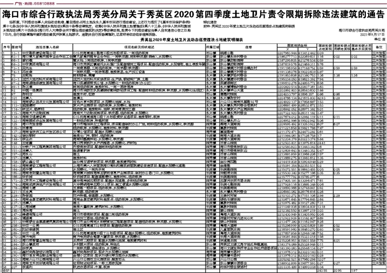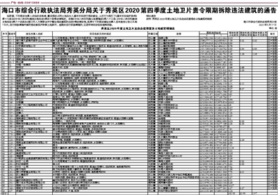 海口市综合行政执法局秀英分局关于秀英区2020第四季度土地卫片责令限期拆除违法建筑的通告