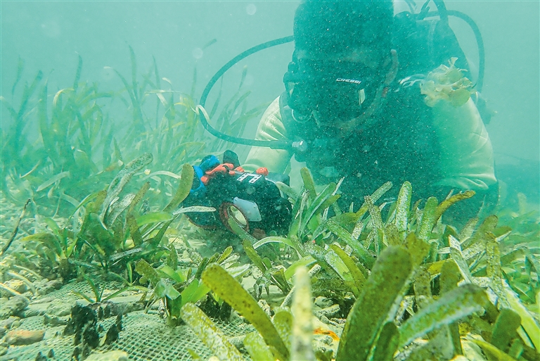 5月18日,在文昌市清澜港至高隆湾段海域,海南省海洋与渔业科学院海洋生态研究所工作人员在查看海草床生长情况。海草床是海岸带的天然生态屏障,此前该海域海底海草资源退化严重,近年来经过修复,海底又见新绿。本报记者 袁琛 摄