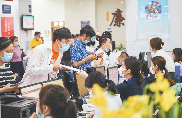 日前,三亚市市场监督管理局联合三亚市政务服务中心,整合设立“企业开办综合服务窗口”,压缩企业开办时间至一个工作日以内。图为窗口人员在服务群众。