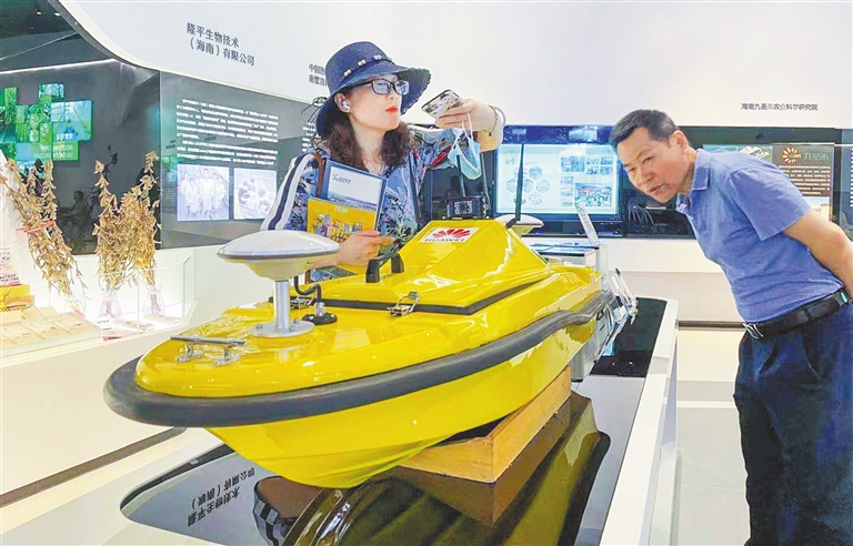 5月18日,海南省第十七届科技活动月开幕式在三亚崖州湾科技城举行。右图为市民在开幕式现场观看科技成果展。
