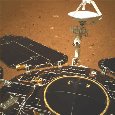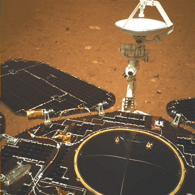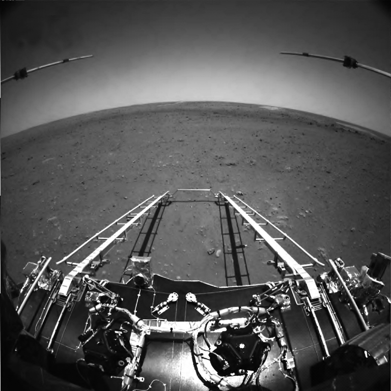 5月19日,国家航天局发布天问一号着陆过程两器分离和落火影像。左图由火星车前避障相机拍摄,正对火星车前进方向。图中可见坡道机构展开正常;图像上部的两个伸杆为已经展开到位的次表层雷达;前进方向地形清晰。右图由导航相机拍摄,镜头指向火星车尾部。图中可见火星车太阳翼、天线展开正常到位;火星表面纹理清晰,地貌信息丰富。新华社发(国家航天局供图)
