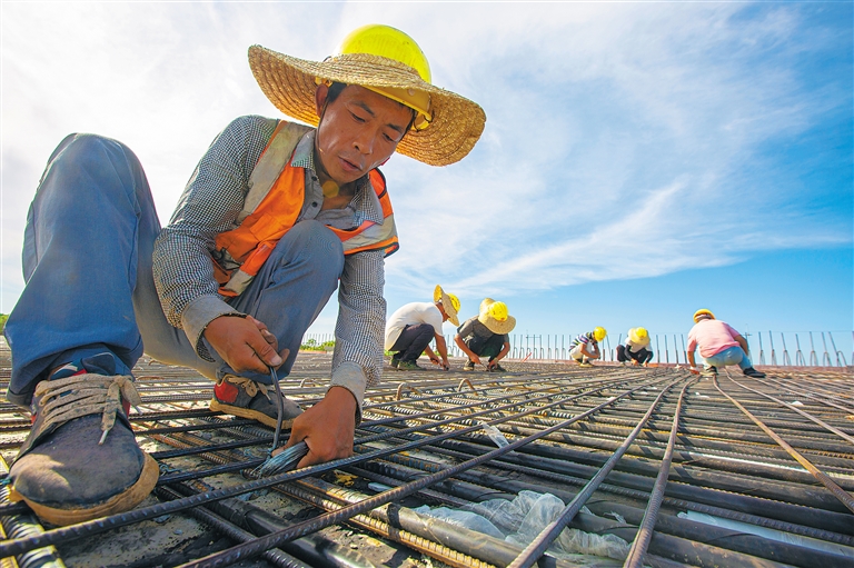 5月19日,国道G360文昌至临高公路文昌段项目施工现场,工人在高温下作业。本报记者 袁琛 摄