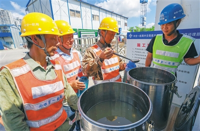 三亚中交国际自贸中心项目承建方调整工作时间,并设立凉茶点,为施工人员提供绿豆汤解暑。
