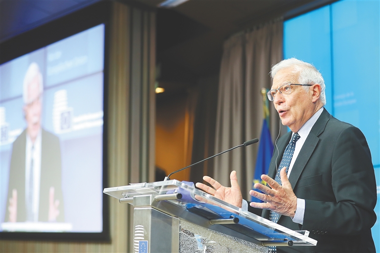 5月18日,在比利时布鲁塞尔,欧盟外交与安全政策高级代表博雷利在会议后举行新闻发布会。