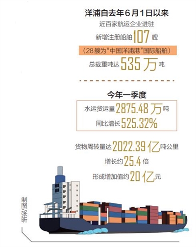 得益于“中国洋浦港”船籍港政策红利,自去年6月1日以来,近百家航运企业进驻洋浦,新增注册船舶107艘,其中28艘为“中国洋浦港”国际船舶,总载重吨达535万吨,占国内登记的国际船舶载重吨的9%。由此带动洋浦水运周转量取得跨越式增长,今年一季度完成水运货运量2875.48万吨,同比增长525.32%。货物周转量达2022.39亿吨公里,增长约25.4倍,形成增加值约20亿元,对GDP增长贡献率57.7%。