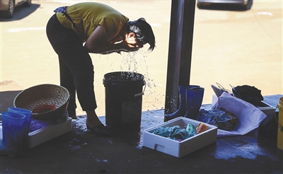 我省近期持续高温。5月19日,在位于海口琼山区的海垦红明农场,一位果农劳作后用清水洗脸降温。本报记者 张茂 摄