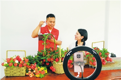 当天上午,活动现场还举办“荔枝王”创意展和“直播带货”等活动,“荔枝冰盘”“520荔枝王果篮”“永兴阿美姨特色清补凉”等系列产品以超高的颜值吸引了众多人的目光。“今天的‘520荔枝果篮’产品,已经被不少情侣预定。”黄时京介绍,他们今年尝试用好荔枝产品讲好故事,扩大火山“荔枝王”的品牌宣传,打开市场新销路,提升农产品附加值,为荔枝产业赋能。