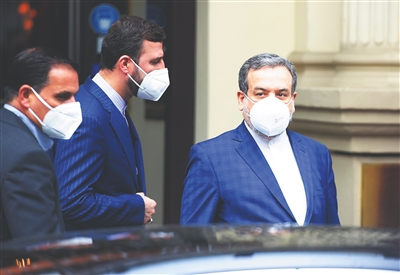 5月19日,在奥地利维也纳,伊朗副外长阿拉格齐(右)出席伊核全面协议联委会新一轮恢复履约谈判政治总司长级会议后离开。