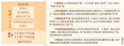 把产业投资摆在突出位置。《行动方案》明确提出,更加注重实体经济发展和产业投资质量,立足海南实际主动调整投资结构,围绕旅游业、现代服务业、高新技术产业三大主导产业以及热带特色高效农业、制造业(即“3+1+1”产业),加大海南产业与国内外产业链的融合力度,建成2个至3个千亿级和5个至7个百亿级重大产业平台,切实提高“3+1+1”产业在投资中的占比,推动海南投资高质量发展。