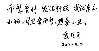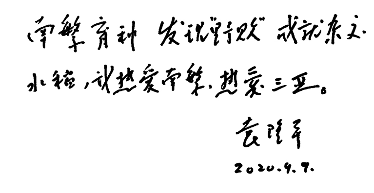 在曹兵的珍藏里,有一副袁隆平院士亲笔题写的书法作品,“南繁育种,发现‘野败’,成就杂交水稻,我热爱南繁,热爱三亚。”