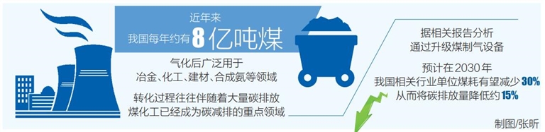 煤,不只是燃料,还是原料。近年来,我国每年约有8亿吨煤气化后广泛用于冶金、化工、建材、合成氨等领域。不过,转化过程往往伴随着大量碳排放,煤化工已经成为碳减排的重点领域。
