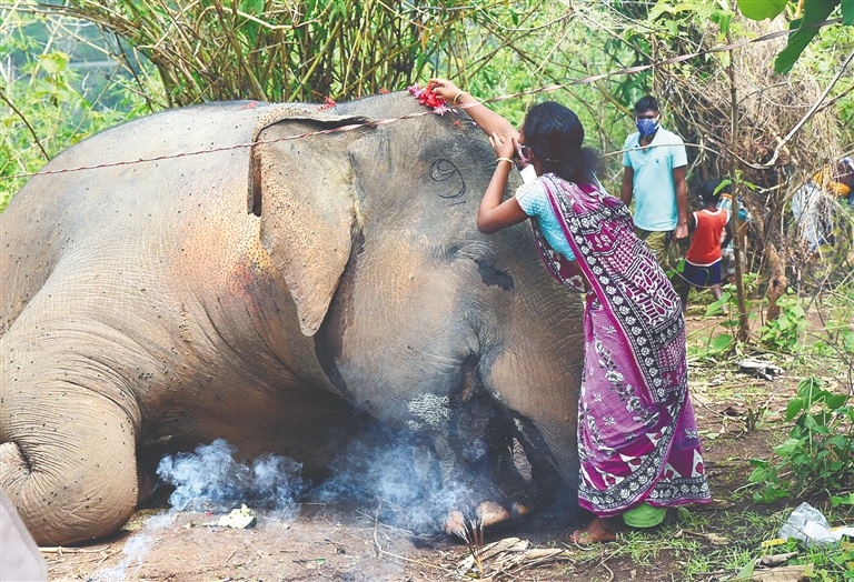 5月14日,一名女子在印度阿萨姆邦纳加奥恩地区一头死去的象旁祷告。