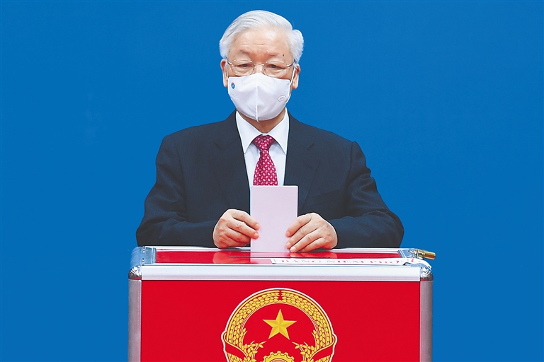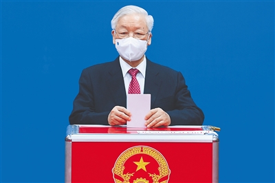5月23日,越共中央总书记阮富仲在越南河内的一处投票点投票。