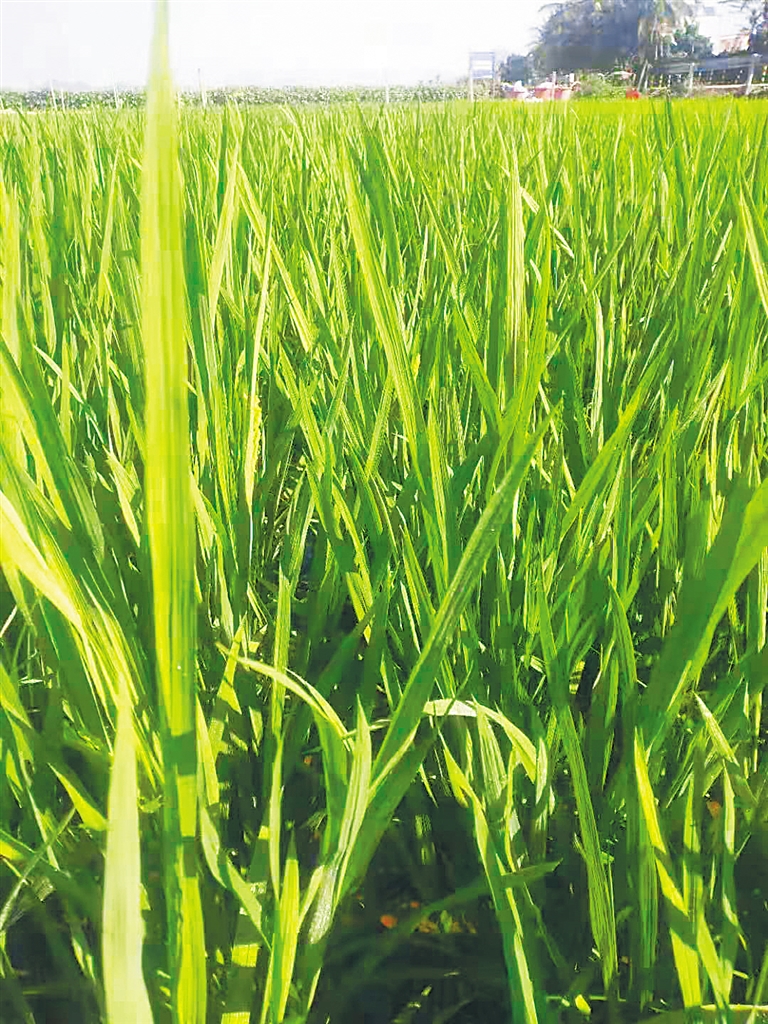 如今在“北稻南移”试验的基础上,根据海南的气候特点,周晓东还探索出一套轮种轮收模式,即在同一块稻田里,一边是翠绿成长的秧苗,另一边是成熟待收割的金黄稻穗,青黄呼应成为一道靓丽的风景。