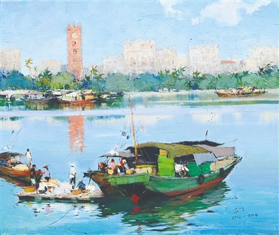 细赏《海口钟楼》,首先映入眼帘的是砖红色的海口地标性建筑——钟楼,后头是水巷口,隐约还能看出骑楼的建筑样式。这些建筑的影子倒映在南渡江面,路旁的斑驳树影也落在水面。视线转到近处,几艘渔船横在江面中间,戴着草帽、晒得黝黑的渔民正在装卸渔获。紫宁盛赞:“画面中透出的亲近人性,回归本真的可贵品质让人窥探到朴素生活之纯美。”