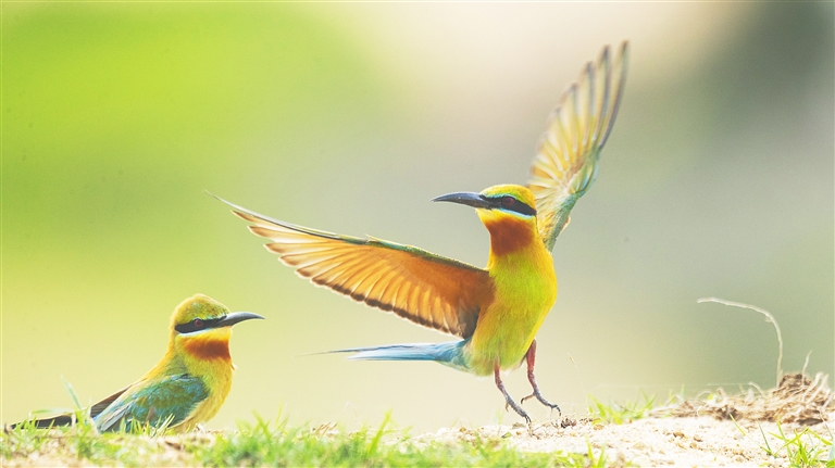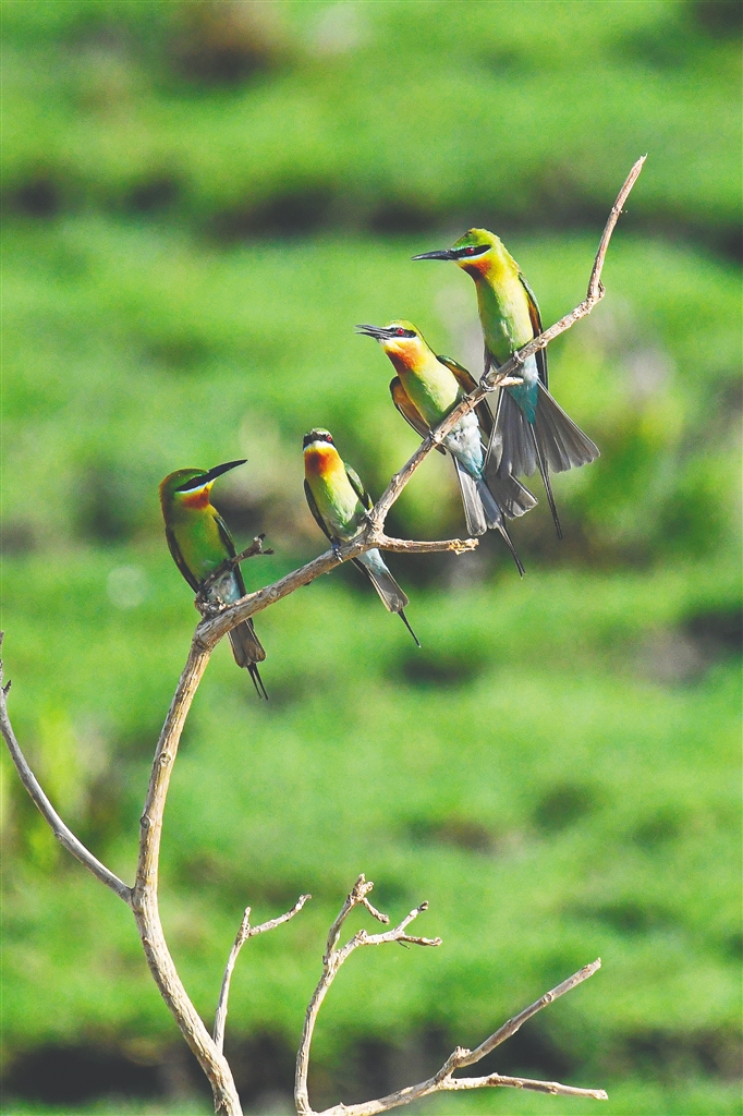 每年3月至7月,这种小鸟会从外地,千里迢迢飞到海南“旅居暂住”。“我们在海口常见的蜂虎是栗喉蜂虎和蓝喉蜂虎。这两种蜂虎的主要分布区域在华南地区和东南亚,冬季在东南亚越冬,春夏季节会飞到我国华南一带繁殖,在海口属于夏候鸟。”海口畓榃湿地研究所鸟类项目专家蔡挺介绍说。