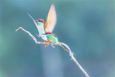 穿“华服”,住“土房子”,蜂虎的特征远不止此。“蜂虎还有着高超的飞行本领和捕食技巧,以空中飞捕昆虫为生,尤其喜欢捕食蜂类。它们能迅猛地抓住蜜蜂,用嘴喙衔着蜜蜂往树枝上摔打,直至把蜂针和蜂针液摔打出去,才会食用。”蔡挺说,根据这一习性,它们的英文名被称作bee-eater,即蜜蜂捕食者,这也是其中文名“蜂虎”的由来。