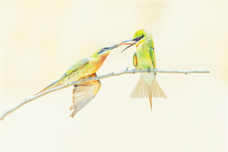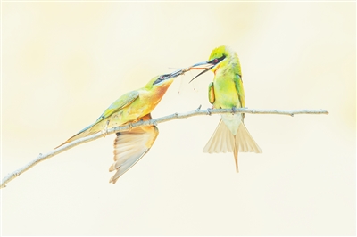 以栗喉蜂虎为例,它身上的色彩犹如《千里江山图》配色,尾翼仿佛着了用青金石提炼出的永不褪色的蓝,双翅及背部则是恰到好处的绿,再配上栗红色的喉部、黑色的过眼纹……在阳光下,这些披在身上的色彩显得绚丽光泽。