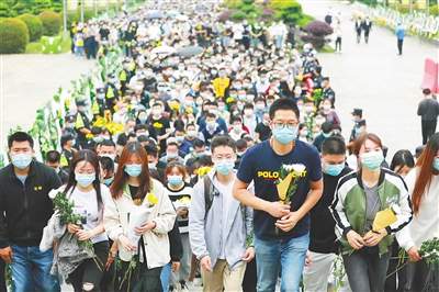 通往殡仪馆的路上,志愿者提供的口罩随处可取,免费供水点一个接着一个。一辆辆出租车、私家车停在路边,为前来悼念的群众提供免费接送服务……一位来自湖北的花店老板自驾送来700束免费鲜花,“等大家领完,我就拿着最后一束献给袁老。”