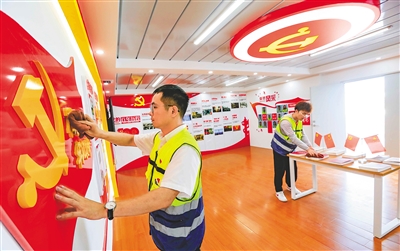 5月24日,在海口市新海港综合交通枢纽(GTC)及配套设施建设工程项目部,施工单位上海建工的工作人员正在对党建文化室进行布置。