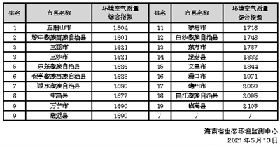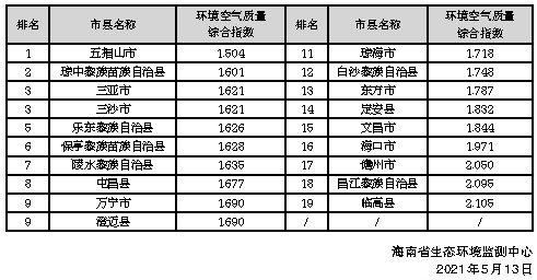 环境空气质量排名靠前的市县分别是五指山市、琼中黎族苗族自治县、三亚市和三沙市(并列第3),排名靠后的市县分别是临高县、昌江黎族自治县和儋州市。2021年4月全省19个市县环境空气质量排名如右:
