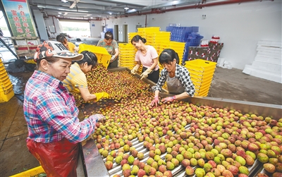 荔枝在什么温度下保存最佳?如何在运送过程中最大限度地保证荔枝的品质……为解决荔枝长途运输问题,红明农场公司打造红明农产品(荔枝)交易中心,通过配备完善冷链设施和引进包装生产线,提供荔枝储存、预冷、分拣、包装、运输等一系列服务,进一步延长荔枝保鲜期。