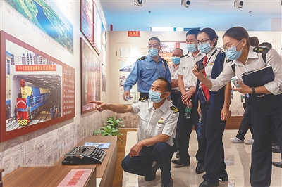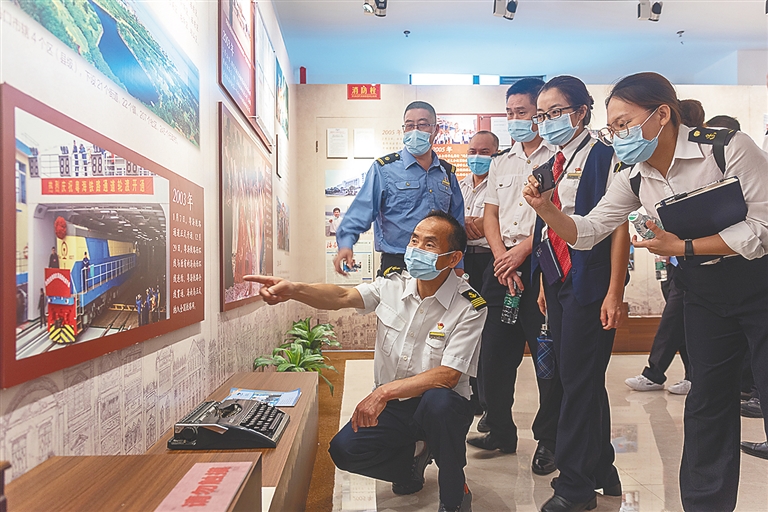 近日,海口机辆轮渡段高铁运用党总支联合船管中心党总支在海南省档案馆开展“用档案讲党史,忆初心强使命”主题党日活动。船长钟祥家(下蹲者)为大家讲述2003年粤海铁路通道轮渡开通时的情况。钟祥家是这趟首发装载列车跨海的铁路渡轮船长,也是这一历史时刻的见证者。