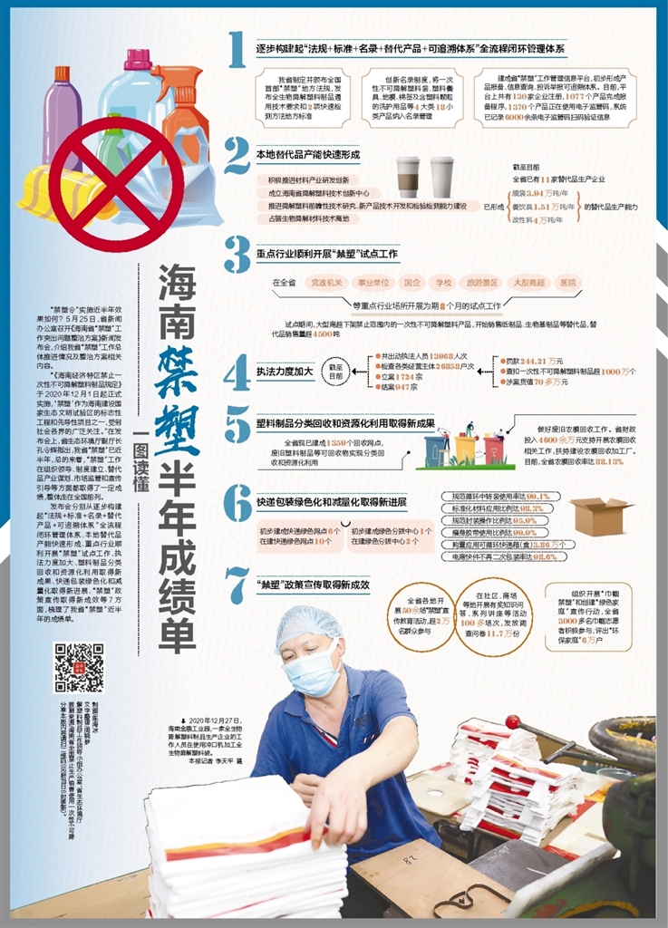 发布会分别从逐步构建起“法规+标准+名录+替代产品+可追溯体系”全流程闭环管理体系、本地替代品产能快速形成、重点行业顺利开展“禁塑”试点工作、执法力度加大、塑料制品分类回收和资源化利用取得新成果、快递包装绿色化和减量化取得新进展、“禁塑”政策宣传取得新成效等7方面,梳理了我省“禁塑”近半年的成绩单。