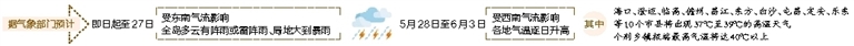 省气象部门5月25日预计,即日起至27日,受东南气流影响,全岛多云有阵雨或雷阵雨、局地大到暴雨,高温天气有所缓解;5月28日至6月3日,受西南气流影响,各地气温逐日升高,其中海口、澄迈、临高、儋州、昌江、东方、白沙、屯昌、定安、乐东等10个市县将出现37℃至39℃的高温天气,个别乡镇极端最高气温将达40℃以上。