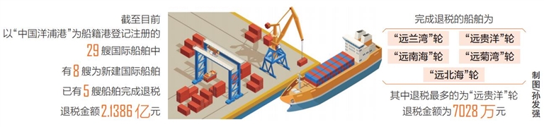 海南中远海运能源运输有限公司副总经理佟明介绍,目前完成退税的船舶为“远兰湾”“远贵洋”“远南海”“远菊湾”和“远北海”轮,共退税金额2.1386亿元,其中退税最多的为“远贵洋”轮,退税金额为7028万元。符合退税条件的还有“远福洋”轮,目前已完成退税申请手续,预计下个月即可完成退税。