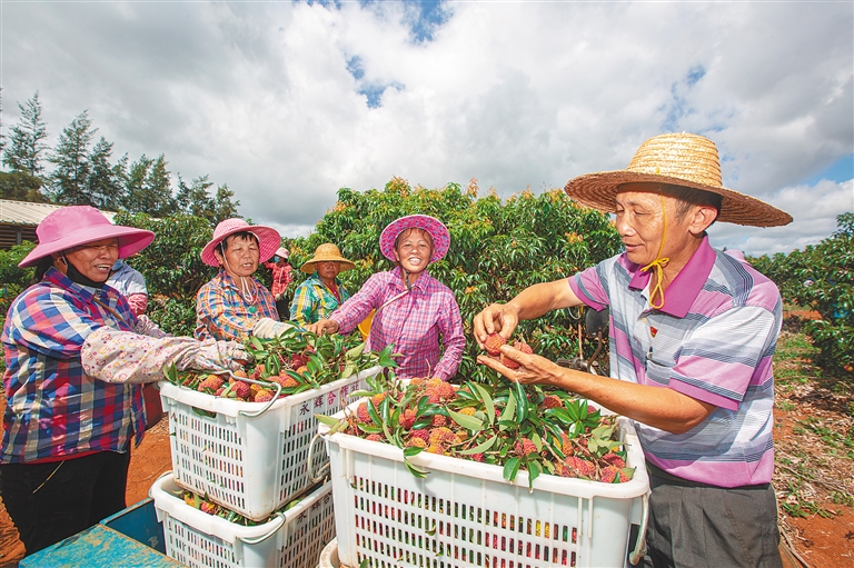 5月28日,在位于文昌市东路镇的海垦东路农场公司的荔枝种植基地,有着专业技术的党员正在指导种植户分级采摘荔枝。据了解,该公司组织党员干部每日深入田间地头,为种植户提供技术指导、销路支持等,推动荔枝产业发展。