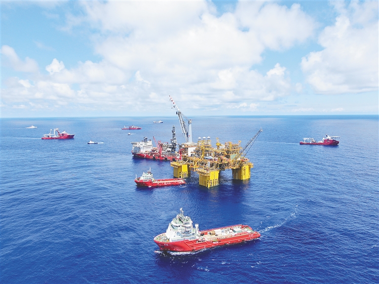 尤学刚介绍,“深海一号”大气田开发难度和生产设施建造安装的复杂程度,在海洋石油开发领域首屈一指,中国海油打破常规的深水油气田开发思路,运用了多项世界领先、国内首创的创新技术攻克世界级深水油气开发难题。在“深海一号”能源站建造安装过程中,采用3项世界级创新和13项国内首创技术,突破12项“卡脖子”技术,成为中国海洋工程装备领域的集大成之作,刷新了全球同类型平台建造速度之最。