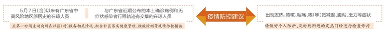 此外,2021年5月7日(含)以来有广东省中高风险地区旅居史的在琼人员,以及与广东省近期公布的本土确诊病例和无症状感染者行程轨迹有交集的在琼人员应第一时间主动向所在社区(村)报备相关情况,配合社区落实健康管理、核酸检测等疫情防控措施。如出现发热、咳嗽、咽痛、嗅(味)觉减退、腹泻、乏力等症状,请做好个人防护,及时到附近的发热门诊进行检查诊疗,就医途中避免乘坐公共交通工具。