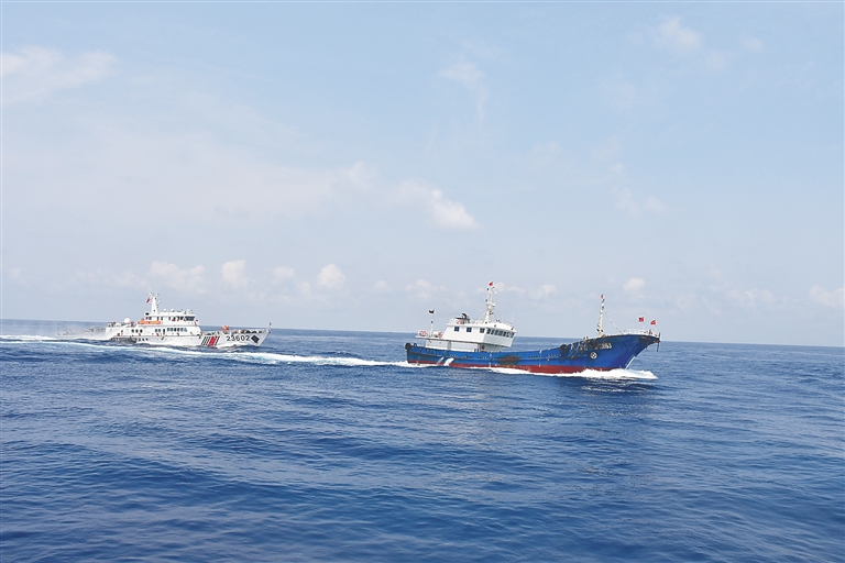 案发时,三亚海警局执法人员驾驶执法船在三亚湾附近海域巡逻时发现一艘航迹可疑的船只,执法人员当即靠前喊话,要求其停船接受检查。但该船只拒不停船,且加大马力逃离。三亚海警局随即派出两艘执法船对其进行围堵拦截。经过近10个小时的追缉。海警执法船成功将该船只逼停,执法人员随即登船检查。