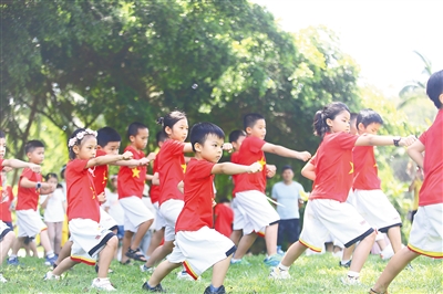 当天上午,在南山景区草坪上,家长和孩子在老师的指导下,一起参加了“毛毛虫赛跑”、儿歌舞蹈汇演、跆拳道表演、欢乐巡游、亲子美食体验等趣味活动,大人的手牵着小孩的手,在其乐融融的活动中,探索大自然的奥妙,感受浓浓的亲子情。文/本报记者 李艳玫 特约记者 陈文武 图/本报记者 武威