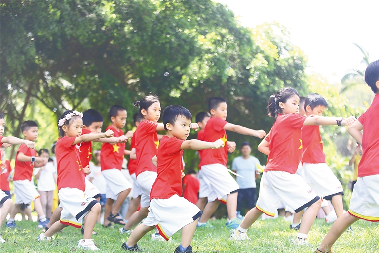 5月29日,三亚南山文化旅游区举行亲子主题活动,100多名家长和孩子及老师一起参加趣味活动和表演节目,迎接“六一”儿童节的到来。图为小朋友在展示跆拳道。