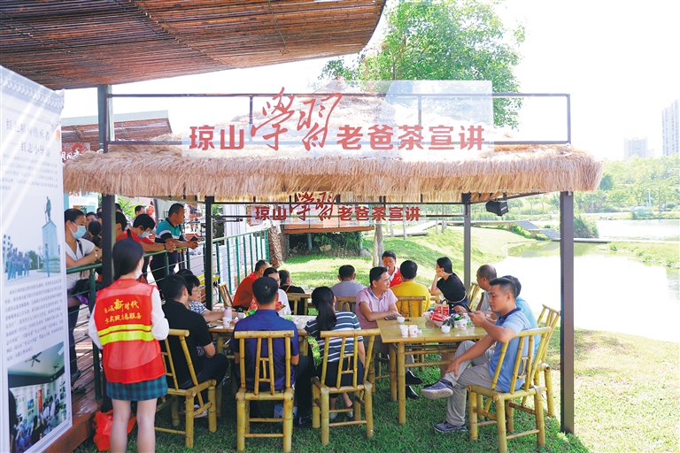 2019年5月,琼山区启动新时代文明实践“益·老爸茶”理论宣讲志愿服务活动以来,边喝茶边听理论宣讲已经成为当地群众喜爱的业余活动之一。广场、茶店、休闲场所……只要是居民聚集的场所,都能成为琼山区的理论宣讲阵地。