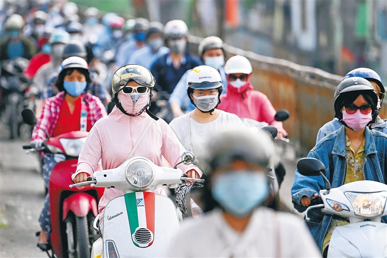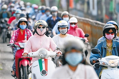 这是5月4日,人们戴口罩在越南河内街头通勤。 新华社/法新