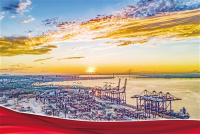 旭日东升,洋浦经济开发区国际集装箱码头,一片繁忙景象。 本报记者 陈元才 摄