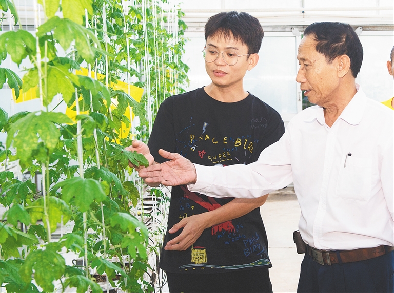 文昌红海村支书符和乐(右)在航天瓜菜大棚和技术员交流种植情况。本报记者 袁琛摄
