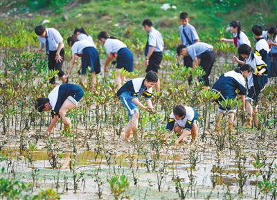海口演丰镇退塘还林区,学生和志愿者一起植树造绿。本报记者 袁琛摄