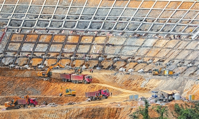 5月27日,在南渡江迈湾水利枢纽工程右坝肩,工人加紧进行143米至113米高程锚索施工。拉运土方的工程车辆往来穿梭,呈现出一派繁忙景象。目前,南渡江迈湾水利枢纽工程两岸边坡的开挖和高程锚索施工正在同时进行,为年底大江截流奠定基础。 据了解,迈湾水利枢纽工程总投资额为73.64亿元,是国家重大水利工程项目之一,预计2024年底建成投入使用。该工程建成后将为周边市县的工农业生产用水和城乡居民用水提供保障,并使海口江东新区防洪标准达到百年一遇。