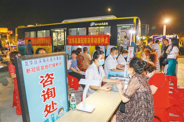 近日,海口市龙华区滨海街道办事处的新冠疫苗移动接种车开进海口世纪公园,让市民利用下班后的休闲时间就能接种新冠疫苗。移动疫苗接种车由海口公交车改造而成,车内配备有冷藏箱、桌椅等装备,保证接种全过程便捷、安全。市民和游客无需预约,每天18时30分至21时30分可在世纪公园接种疫苗。图为市民游客在咨询疫苗接种注意事项。