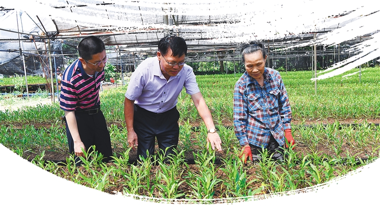 海口市龙华区新坡镇仁里村依托海南石斛健康产业园,引导推动三产融合,大力推广种植石斛,带动村民增收致富。图为海南省纪委监委驻省农业农村厅组前往石斛种植基地实地调研监督。 杨宁 摄