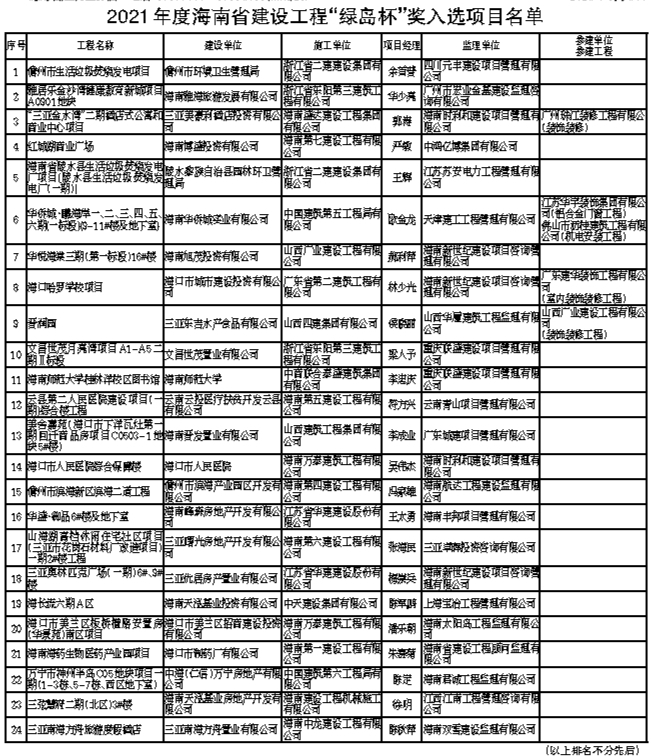 受海南省住房和城乡建设厅委托,海南省建筑业协会开展的2021年度海南省建设工程绿岛杯奖评选工作,经过初审、工程检查和评选委员会评议等程序,业已结束。为体现“公开、公正、公平”原则,现将评选委员会评议通过的24项工程向社会公示。自本公示发布之日起7日内,如发现所公示的工程存在问题,请向以下单位反映:
