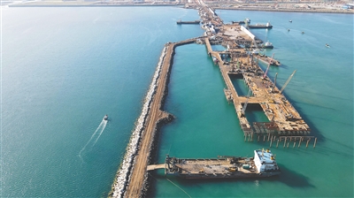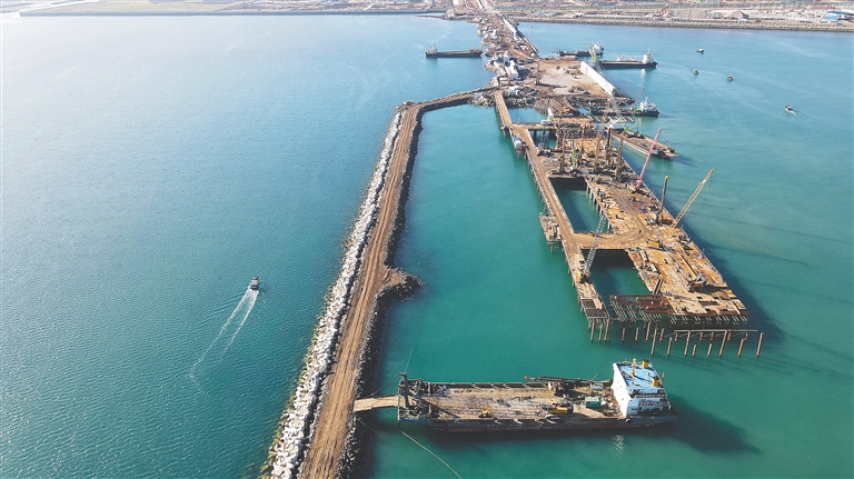 5月27日,在洋浦经济开发区中石化海南炼化百万吨乙烯及炼油改扩建项目配套码头,工人正加紧施工,码头初现雏形。
