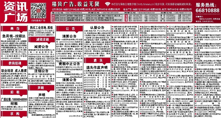 ●海南新闻旅游公司遗失公章、财务专用章,法人章(陈总良)各一枚,声明作废。