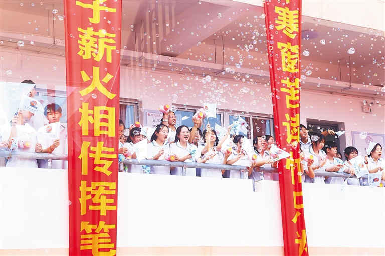 6月2日9时,海南华侨中学教学楼里,随着一声呼唤,整栋楼师生聚集到走廊上,一年一度的“喊楼”活动如约开启。“喊楼”活动是该校多年传统,活动形式活泼,喊话内容积极向上,能很好地让学生释放压力,舒缓情绪。文/本报记者 计思佳 图/本报记者 张茂