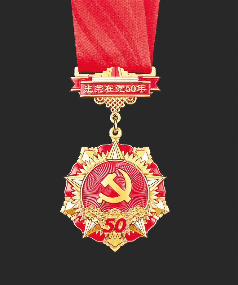 “光荣在党50年”纪念章通径为50毫米,材质为铜和锌合金,主色调为红色和金色。主章由党徽、五角星、旗帜、丰碑、向日葵、光荣花、光芒等元素构成,其中党徽象征党的领导核心地位和党员信念坚定、对党忠诚;丰碑寓意党的光辉历程和丰功伟绩;向日葵寓意全党全国各族人民紧密团结在党中央周围;光芒象征党的光辉照耀;五角星代表薪火相传;光荣花寓意繁荣盛世、国泰民安和褒奖荣耀;旗帜象征共产主义崇高理想与事业永续。副章由山河、中国结和红飘带等元素组成,飘带上雕有“光荣在党50年”字样,寓意党员不忘初心、牢记使命,勇攀高峰、永葆青春。