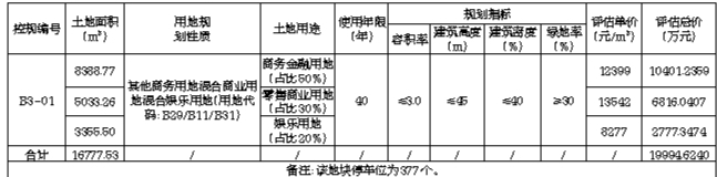 本次挂牌出让宗地位于三亚互联网信息产业园——信息创意产业园控规B3-01地块内,CGCS2000坐标系总面积16777.53平方米(海南平面坐标系总面积16768.49平方米),用地四至及界址坐标详见地块勘测定界图。该宗地规划用地性质为其他商务用地混合商业用地混合娱乐用地(用地代码:B29/B11/B31,混合比例5:3:2),对应土地用途分别为商务金融用地、零售商业用地、娱乐用地。具体情况如下:1.商务金融用地,CGCS2000坐标系面积8388.77平方米(海南平面坐标系面积8384.24平方米);2.零售商业用地,CGCS2000坐标系面积5033.26平方米(海南平面坐标系面积5030.55平方米);3.娱乐用地,CGCS2000坐标系面积3355.50平方米(海南平面坐标系面积3353.70平方米)。